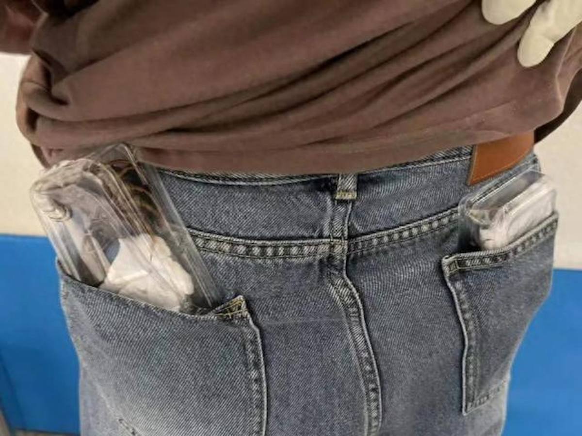 一名女子在其褲兜、腰部、胸前檢獲綁藏的活體動物一批。(海關圖片)