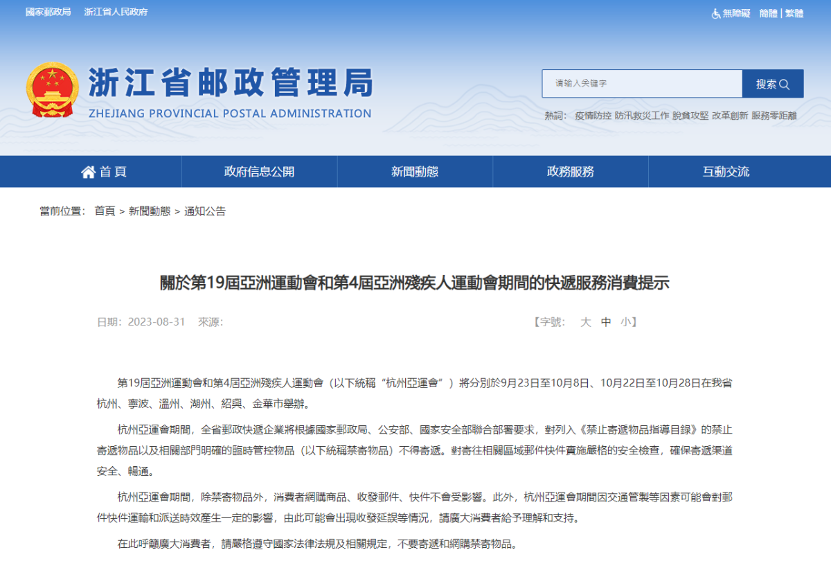 官方指出,杭州亞運會期間因交通管制等因素可能會對郵件快件運輸和派送時效產生一定的影響,由此可能會出現收發延誤等情況,請廣大消費者給予理解和支持。