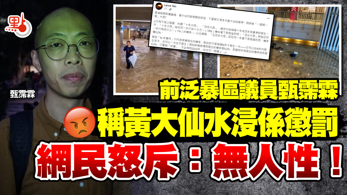 面對如此嚴重天災,前泛暴區議員甄霈霖竟然出帖嘲諷:「香港呢期妖魔當道,黃大仙可能懲罰班妖怪,下星期又浸多次黃大仙站都得。到時係『一星期一預』大雨? 」。甄霈霖顯然是在幸災樂禍、落井下石,有網民鬧爆佢「無人性」。