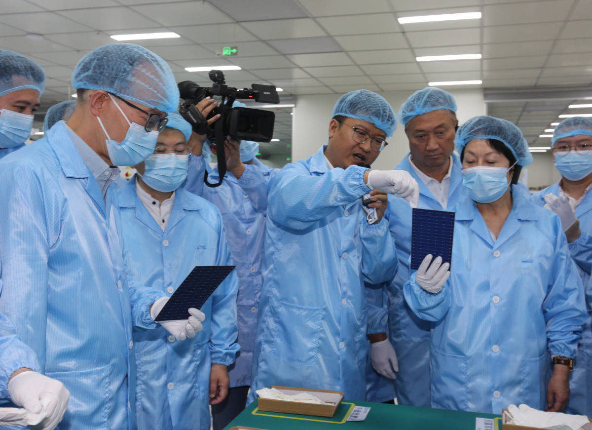視察組馬不停蹄到歐昊集團金剛光伏廠房視察。2021年金剛玻璃進軍光伏產業,投資25億元,在酒泉經濟技術開發區南園建設年產4.8GW高效異質結電池及組件生產專案,廠房佔地面積800畝。現時1.8GW生產線已正式投產,未來將再投產一條3GW生產線;在專案全部建成後,預計實現年產值78億元,將成為國內最大的高效異質結電池生產基地,助推酒泉新能源裝備製造產業。