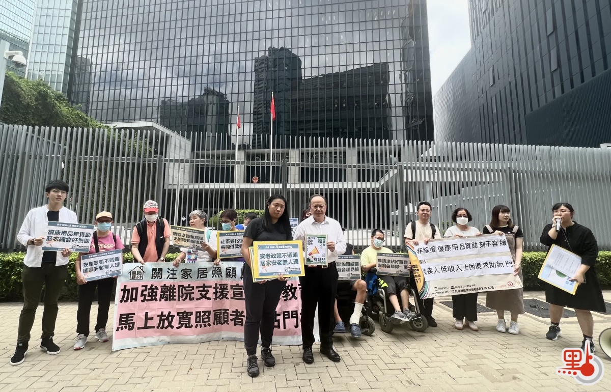 【點新聞報道】關注家居照顧服務大聯盟一眾成員,聯同殘疾人及長者團體,今日 (12日) 於政府總部外發起請願行動,要求政府正視現有長期護理政策的不足,降低「照顧者津貼」的申請門檻。
