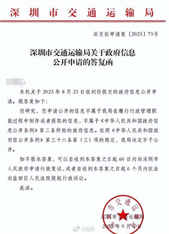 據人民網深圳抖音賬號9月10日消息,有網友曬出一則深圳市交通運輸局關於政府信息公開申請的答覆函,表示該答覆函是針對深圳「前交通局長孫女」炫富事件的答覆。答覆函中寫道:「經研究,您申請的公開信息不屬於我局在履行行政管理職能過程中製作或者獲取的信息,不屬於《中華人民共和國政府信息公開條例》第二條所稱的政府信息。依照《中華人民共和國政府信息公開條例》第三十六條第三項的規定,我局決定不予公開。」
