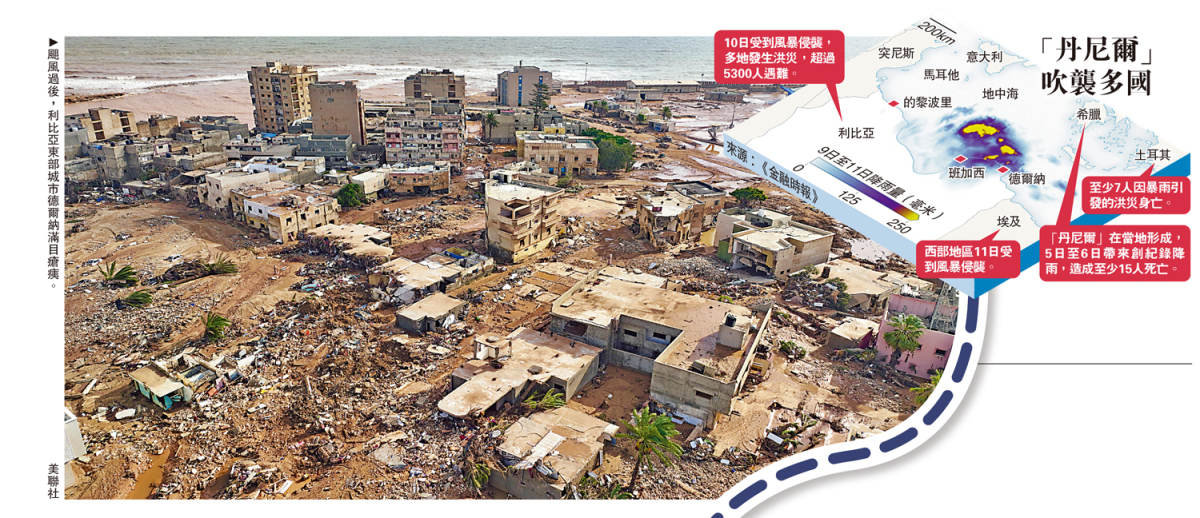 大公報綜合美聯社、法新社、路透社報道:颶風「丹尼爾」襲擊北非國家利比亞東部地區,截至13日已造成超過5300人遇難,至少9000人失蹤,重災區德爾納市超過3萬人無家可歸。專家指出,受全球變暖影響,今年地中海海平面溫度異常升高,「丹尼爾」威力增強,橫掃希臘、土耳其等地後撲向利比亞,帶來史無前例的極端暴雨。德爾納市附近兩座老化的水壩倒塌,洪水摧毀橋樑、阻斷道路,救援隊難以進入災區,死亡人數恐進一步增加。