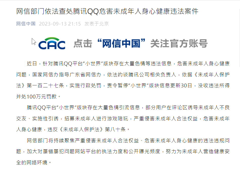 網信中國指出,騰訊QQ平台「小世界」版塊存在大量色情引流信息,部分用戶在評論區誘導未成年人不良交友、實施性引誘,招募未成年人進行遊戲陪玩,嚴重侵害未成年人合法權益,危害未成年人身心健康,違反《未成年人保護法》第80條。