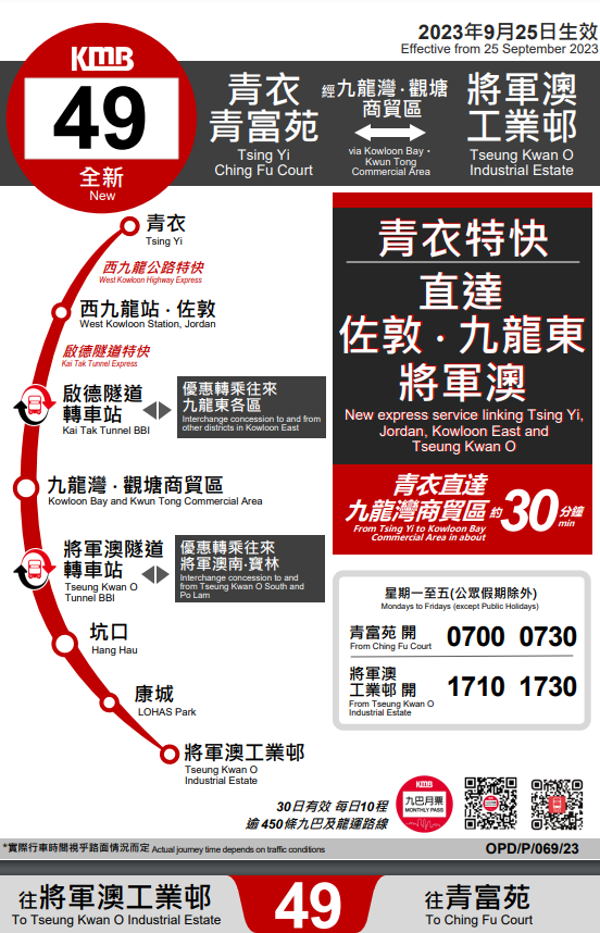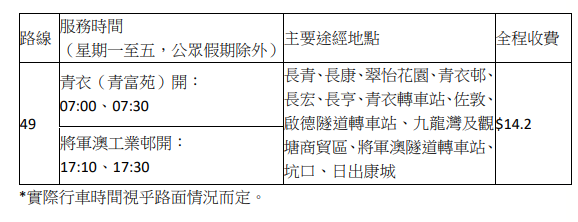 九巴續指,49線早上繁忙時段由青衣(青富苑)開出兩班車前往將軍澳工業邨,亦會於下午繁忙時段開出兩班回程車由將軍澳前往青衣。