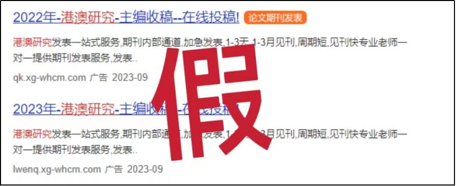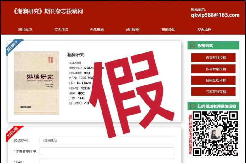 有網站聲稱提供「一站式服務」「期刊內部通道」「主編收稿」「加急發表」等服務,誘騙作者投稿後發出虛假的用稿通知書謊稱已獲《港澳研究》採用稿件,更巧立名目騙取高額版面費。《港澳研究》指,這些違法行為性質惡劣,不僅給作者帶來財產損失,也嚴重損害本刊聲譽,已向有關執法部門舉報,又嚴正聲明該刊從不收取作者任何形式的審稿費、版面費等費用。