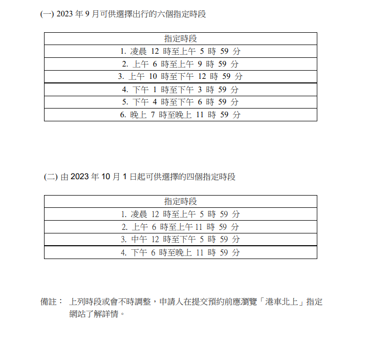 為便利已取得「港車北上」資格市民的出行,由10月1日開始,指定出行時段會由六個調整至四個。系統會由9月15日凌晨1時起,開放十月份的出行時段供申請人預約。