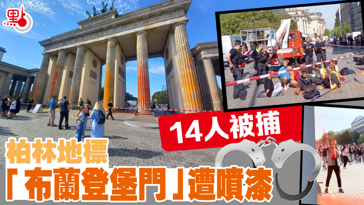 環保組織「最後世代」的成員向勃蘭登堡門東側的六條柱,噴上黃色和橙色的油漆,要求德國在2030年前全面禁用化石燃料。柏林警方表示,注意到抗議人運用液壓升降裝置,警方阻止他們攀爬這處地標建物,並且當場拘捕所有14名成員,當局將展開調查。