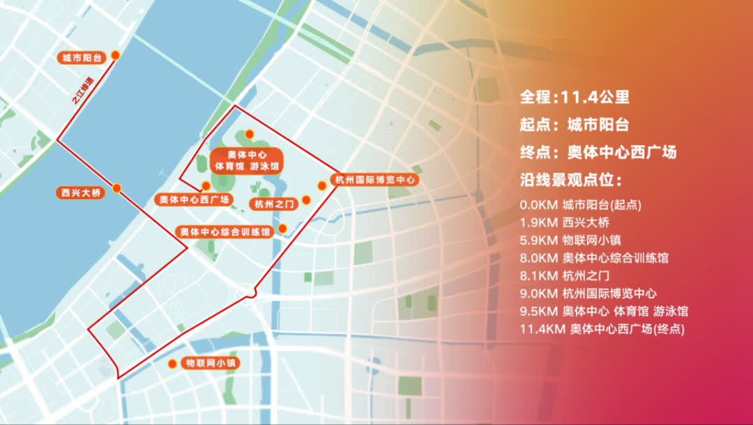 從城市陽台出發後沿之江綠道——西興大橋——物聯網小鎮——奧體中心綜合訓練館——杭州之門——杭州國際博覽中心,最後進入杭州奧體中心西廣場舉行收火儀式。