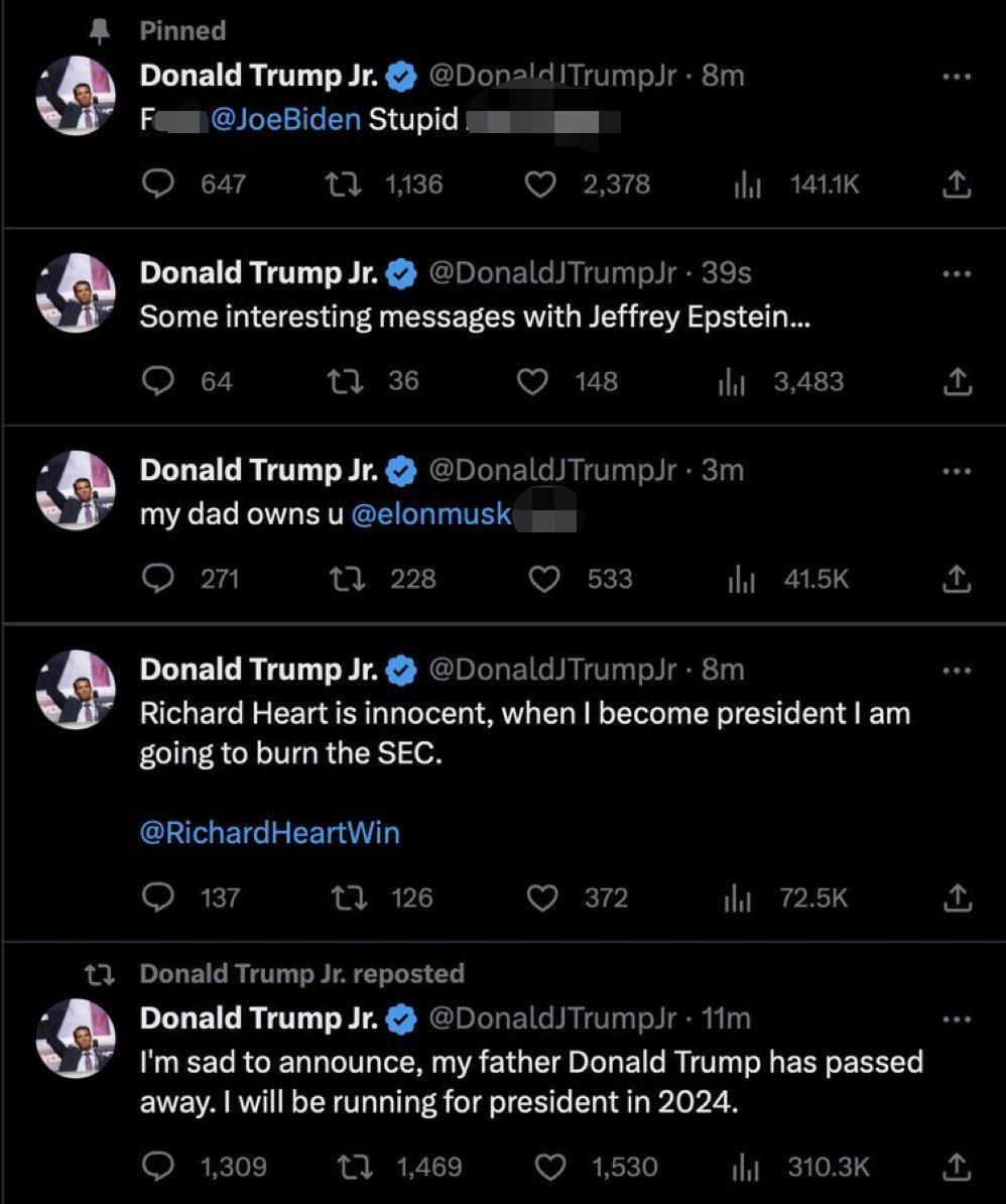 【點新聞報道】特朗普長子唐納德(Donald Trump Jr.),在社交平台X(前稱推特)有超過1000萬名追隨者。不過其社交專頁當地時間周三(20日)上午8時突然發出連串驚人帖文,包括宣布他的父親特朗普已經逝世,自己將代父出征競選總統,且當選總統後將燒毀美國證券交易委員會等內容。