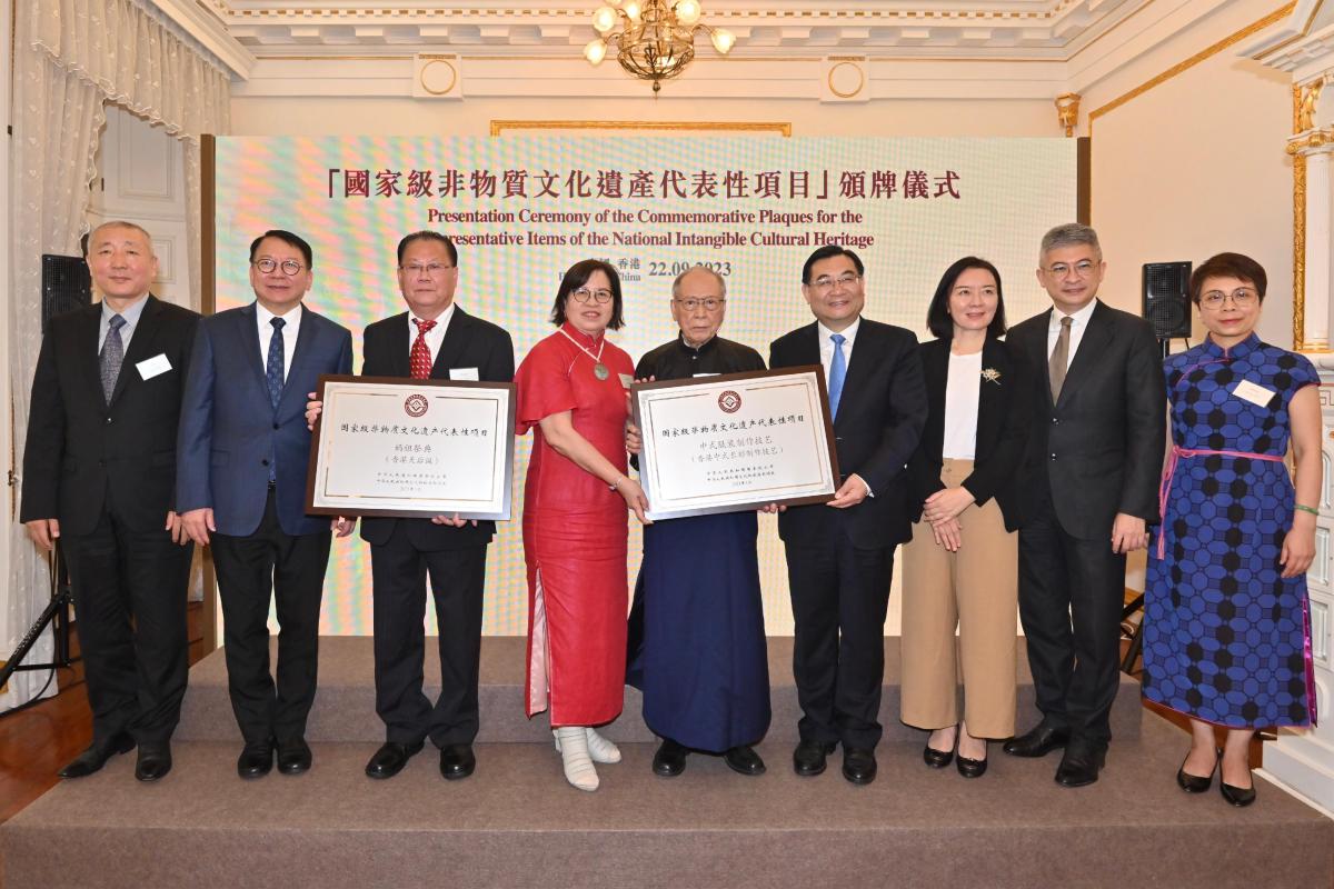 【點新聞報道】本港兩個非物質文化遺產項目——香港天后誕和香港中式長衫製作技藝,早前獲列入國務院於2021年公布的第五批《國家級非物質文化遺產代表性項目名錄》。國家文化和旅遊部部長胡和平今日(22日)在孫中山紀念館向兩個國家級非遺代表性項目的保護單位——香港天后誕協會和香港長衫協會的代表頒發牌匾,署理行政長官陳國基、署理文化體育及旅遊局局長劉震和署理康樂及文化事務署署長譚美兒出席參與頒發儀式。