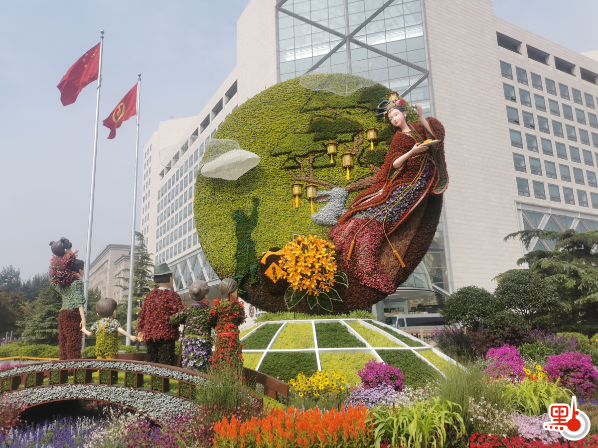 在西單西北角的「花好月圓」花壇頂高8米,以一家人中秋團聚的溫馨畫面為場景,體現了花好月圓下百姓幸福生活。其中,各種花卉布置的「嫦娥奔月」形象逼真,可以清晰看見「嫦娥」手中盤子裏擺放着象徵團圓和美的月餅。
