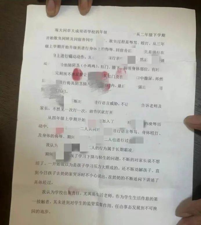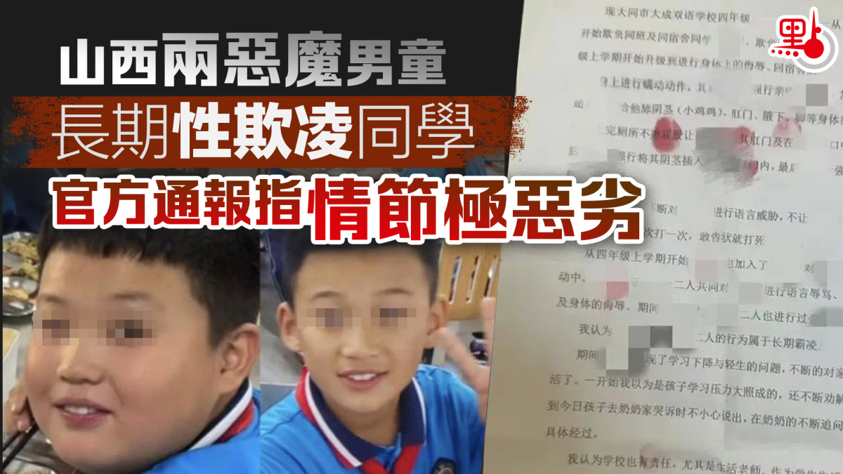 【點新聞報道】山西大同市大成雙語學校發生恐怖校園性侵欺凌事件。據網傳信息,兩名四年級男生,涉嫌長年性欺凌一名10歲男同學,甚至逼對方喝尿、舔肛乃至性侵。事件曝光後,大同市組成由教育、公安、檢察、司法行政等部門參與的聯合工作小組進行調查及相關工作。