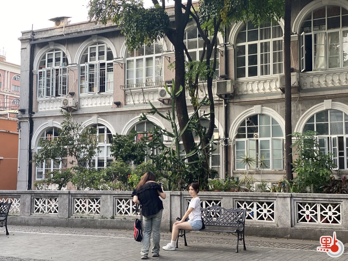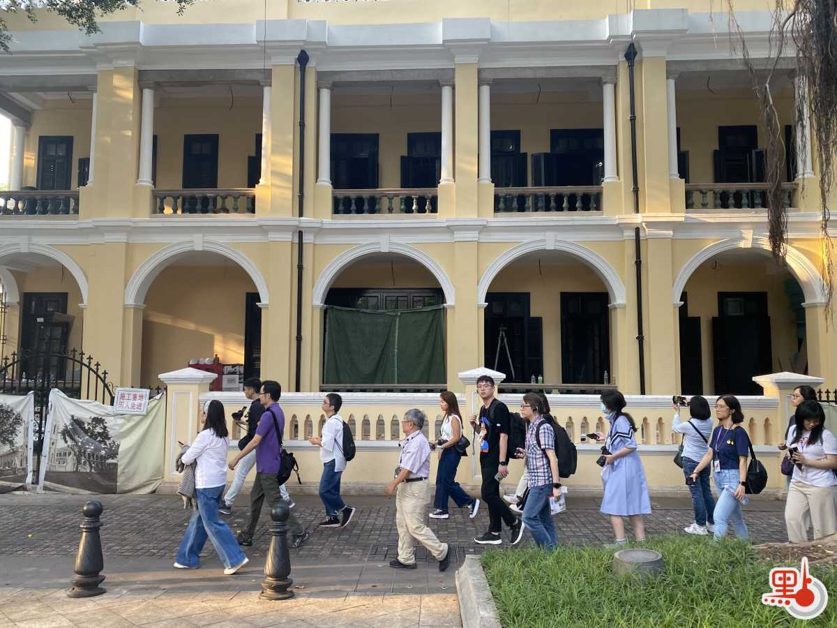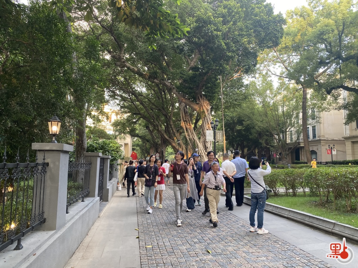 近一日的「特種兵」行程結尾,考察團來到沙面歷史建築群,這裏曾是繁忙的商業港口和交通樞紐,鴉片戰爭後淪為英、法租界地。由於這裏有新巴洛克式建築、中式傳統建築和西方古典建築等,有同學直接將這裏比如為另一個「上海外灘」。沙面古樹成蔭,各有各的姿態和特色。街上亦有不少新人拍攝婚紗照、打卡,有世外桃源的感覺。不少同學表示,自己從小紅書上搜到的廣州旅遊攻略很少有提到沙面,所以此次安排亦是一個驚喜。現如今,曾經的領事館、洋行等已經有了新的功能,歷史曾在這裏發生,又因為適得其所的活化讓這裏變得獨一無二。