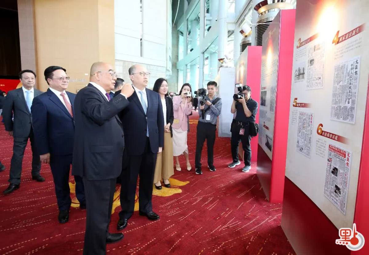 中央政府駐港聯絡辦主任鄭雁雄、副主任盧新寧,今日(27日)參加香港文匯報創刊75周年慶祝儀式時,在香港大公文匯傳媒集團董事長、總編輯兼香港文匯報社社長、大公報社社長李大宏,及香港文匯報總編輯吳明的陪同下,參觀了現場的香港文匯報展板內容。