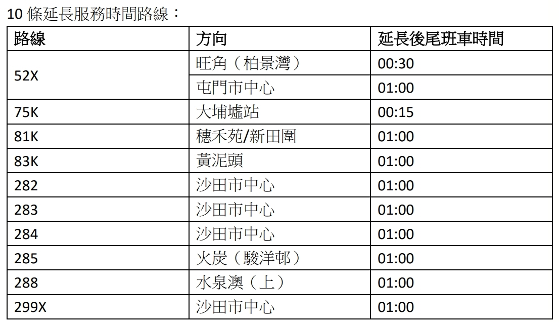 電車會延長服務至翌日凌晨1時,並會因應乘客需求情況加強服務。天星小輪、新渡輪及港九小輪所提供的渡輪服務會因應乘客需求情況加強服務。