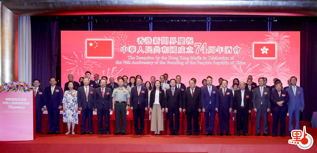 【點新聞報道】香港新聞界慶祝中華人民共和國成立七十四周年酒會今日(28日)下午在香港君悅酒店隆重舉行。香港特別行政區行政長官李家超、中央政府駐港聯絡辦副主任盧新寧、外交部駐港特派員公署署理特派員潘雲東、香港特別行政區政府政務司司長陳國基、香港特別行政區政府律政司司長林定國、中國人民解放軍駐香港部隊政治工作部副主任王志學、香港新聞界慶祝國慶籌委會主席、香港新聞工作者聯會主席李大宏等主禮。