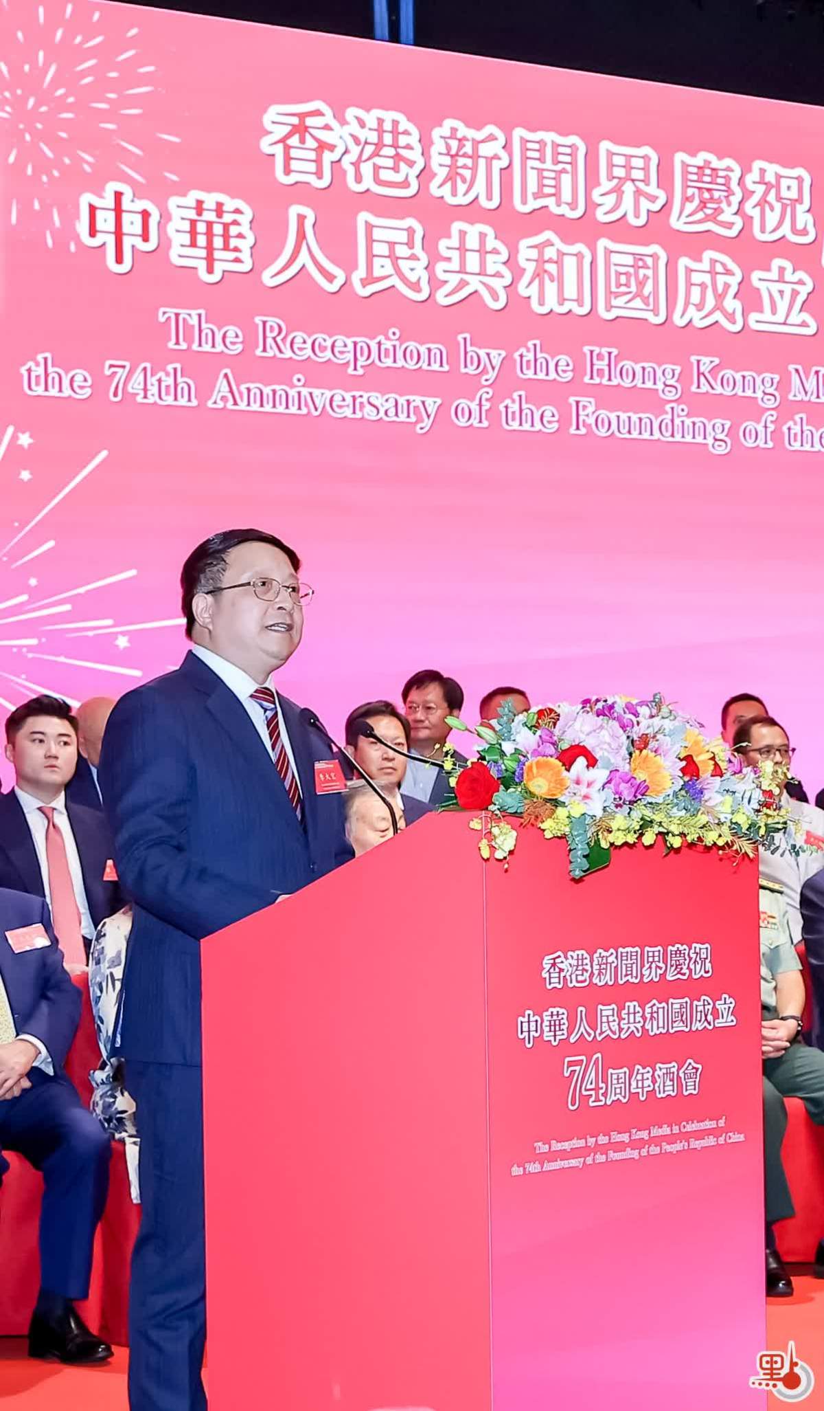 香港新聞界慶祝國慶籌委會主席、香港新聞工作者聯會主席李大宏致辭時表示,過去的七十四年,在中國共產黨的領導下,新中國經歷了從站起來、富起來到強起來的偉大飛躍,成就了彪炳史冊的不朽傳奇。中共十八大以來,習近平總書記以中國夢這一核心概念,重塑中國信仰、重聚中國力量、擘畫發展藍圖,勾勒出中國巨輪駛向理想彼岸的清晰航線。香港的命運從來與祖國緊密相連。香港回歸祖國以來,中央堅定不移貫徹落實「一國兩制」、「港人治港」、高度自治方針,香港與祖國內地和衷共濟、守望相助,共同創造了經濟騰飛、體制創新的中國奇跡,香港新聞界在此過程中發揮了不可或缺的作用。