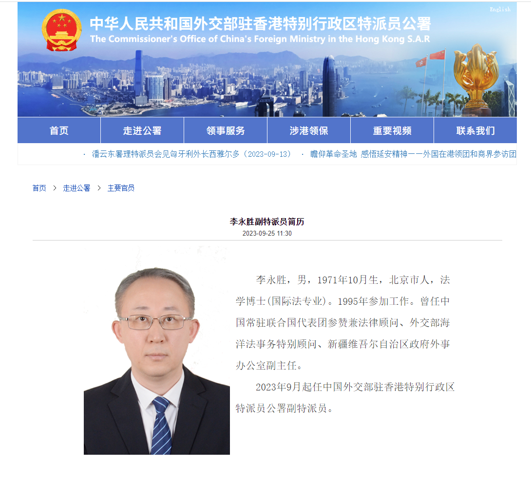 外交部駐港公署網站9月25日公布,李永勝副特派員已於近日抵港履新,楊義瑞副特派員已奉調離任回京。網站近日更新的簡歷顯示,李永勝,男,1971年10月生,北京市人,法學博士(國際法專業)。1995年參加工作。曾任中國常駐聯合國代表團參贊兼法律顧問、外交部海洋法事務特別顧問、新疆維吾爾自治區政府外事辦公室副主任。2023年9月起任外交部駐香港特別行政區特派員公署副特派員。