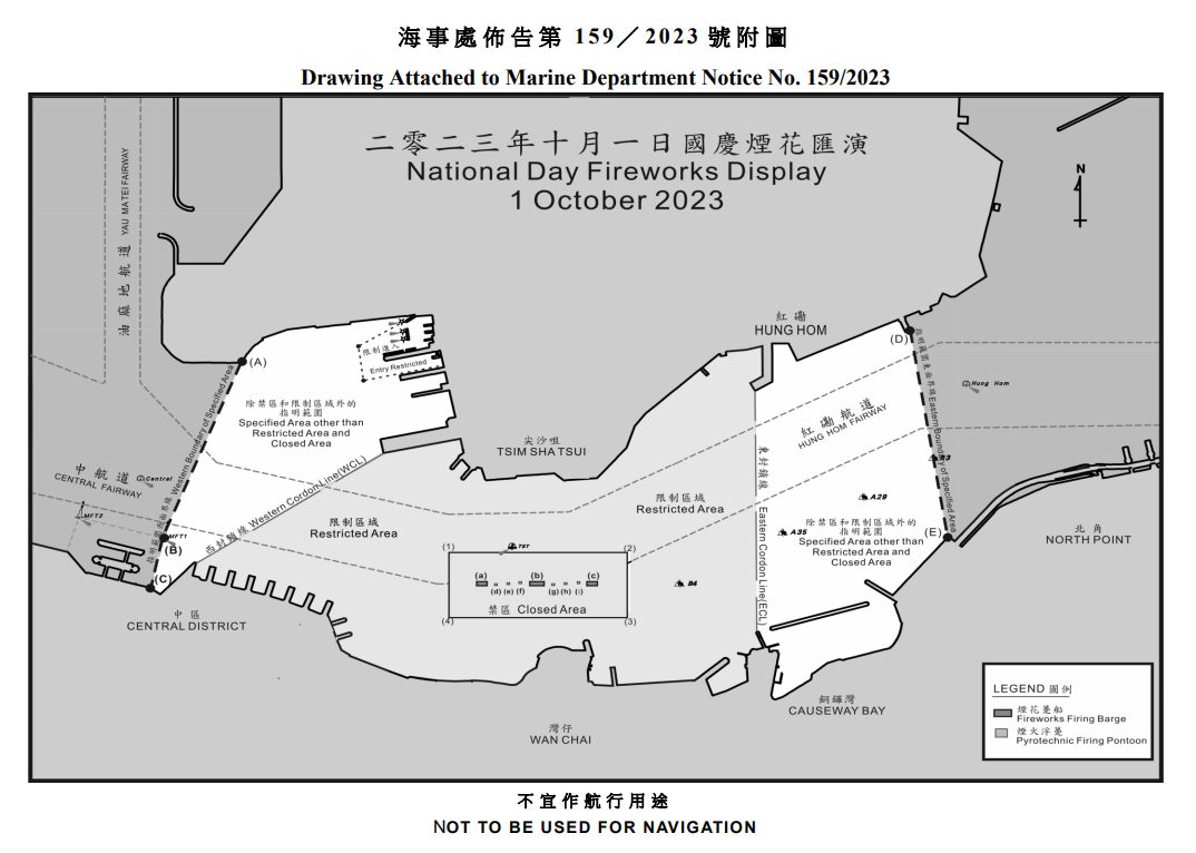 海事處會於今日下午2時至晚上約11時,在燃放煙花的躉船及煙火的浮躉停泊範圍,即灣仔香港會議展覽中心對開海面,設立禁區,禁止任何船隻進入。而在晚上8時至約10時,維多利亞港中部將設立限制區,除獲特別許可的船隻外,其他船隻不得進入;獲批准的定期渡輪則可維持服務至晚上8時;限制區內所有公眾登岸梯級會在當晚7時30分至約10時暫時關閉。此外,觀賞煙花的船隻可在限制區和禁區外的指明範圍內觀賞,有關範圍在晚上7時至10時實施。