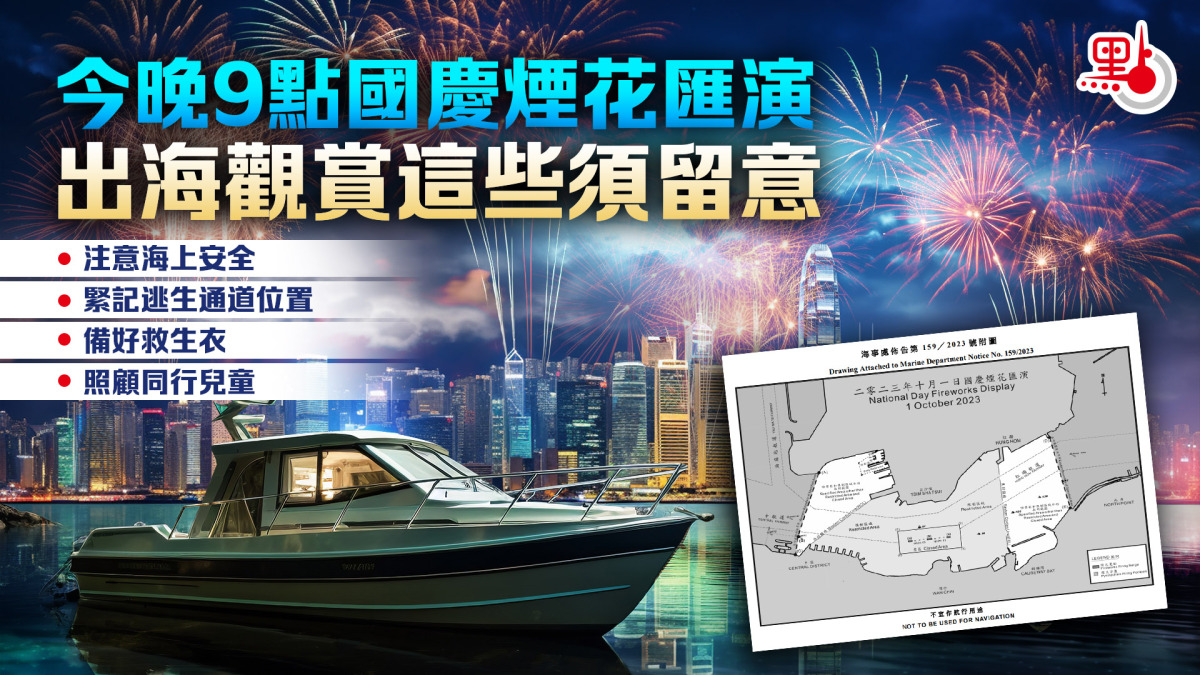 因應今晚舉行的國慶煙花匯演,海事處提醒市民出海觀賞匯演時須注意海上安全。家長或成年人須照顧同行的兒童,確保他們全程穿着救生衣;船長需備有一份乘客和船員名單,以備不時之需。啟航前,乘客應了解船上緊急逃生出口位置,亦須知道救生衣擺放的位置和穿着方法;船隻切勿超速、超載。