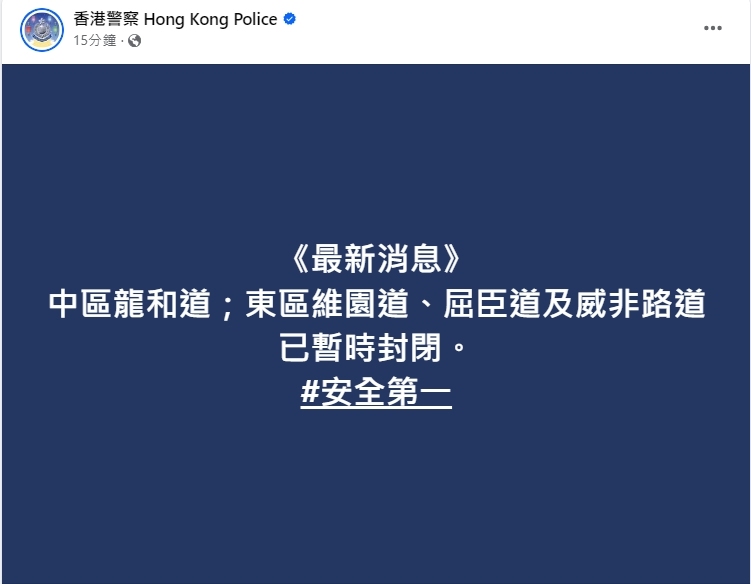到晚9時,警方表示,駱克道及謝菲道(介乎波斯富街及盧押道)已暫時封閉。