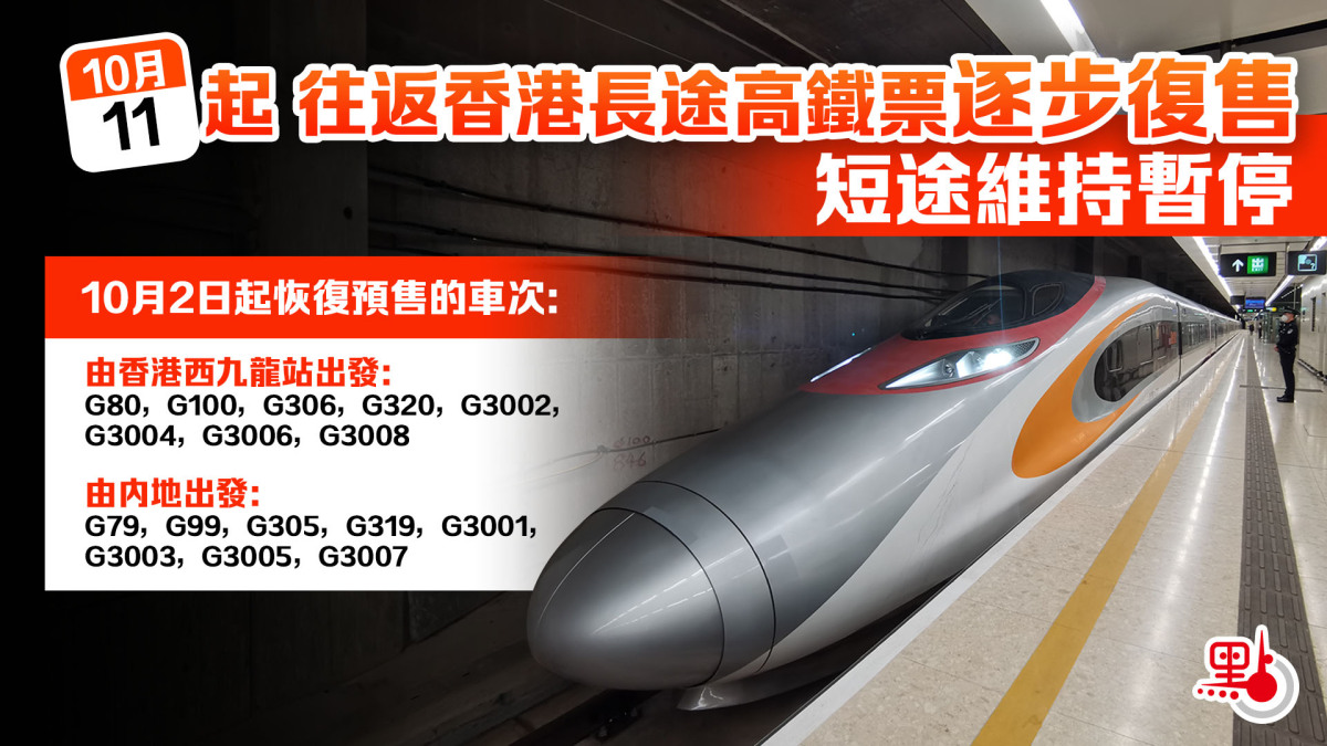 【點新聞報道】據內地鐵路部門昨日(10月1日)通報,10月11日起來往香港西九龍及內地的部分長途列車行車時間表及票務系統已完成調整,現逐步恢復發售車票;而短途列車車票預售服務則維持暫停直至另行通知。