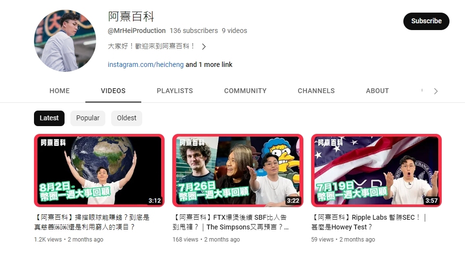 自今年5月起,鄭雋熹在YouTube開設個人頻道「阿熹百科」。翻查頻道,所發布的9條短片全部關於虛擬貨幣投資及NFT,由他本人擔任主演。最近一條片發布時間為8月2日。