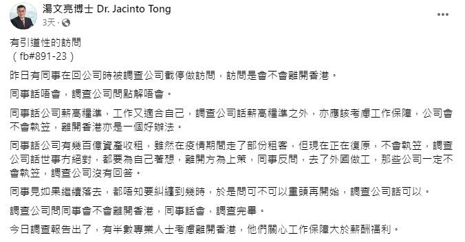 湯文亮在文末諷刺,調查報告出來後,顯示半數專業人士考慮離開香港,他們關心工作保障大於薪酬福利。只是不知道,該調查報告反映的到底是港人的真正意願,還是機構預設立場後引導而來的結果呢?