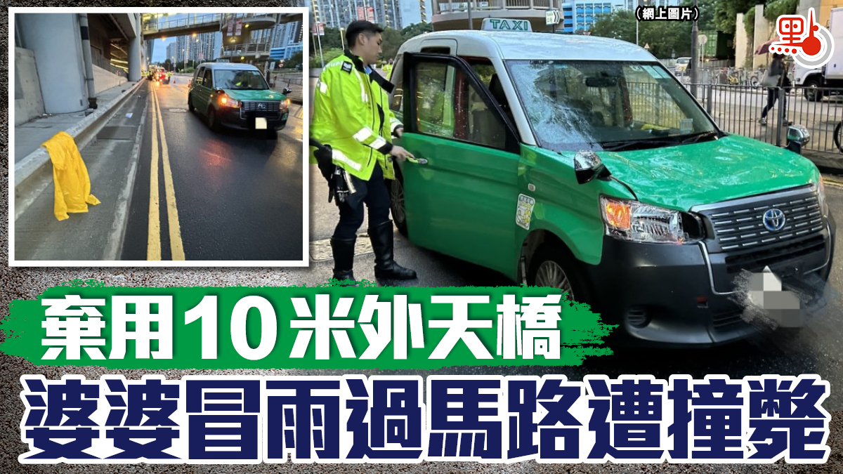 昨日清晨約5時05分,一名姓黃(84歲)老婦在港鐵朗屏站對開,冒雨打傘步出橫過朗業路時,一輛載客新界的士駛至,司機疑收掣不及將老婦撞倒,繼而彈上車頭擋風玻璃再反彈墮地,導致老婦頭部及身體多處受傷昏迷,送抵博愛醫院搶救至清晨5時56分證實不治。