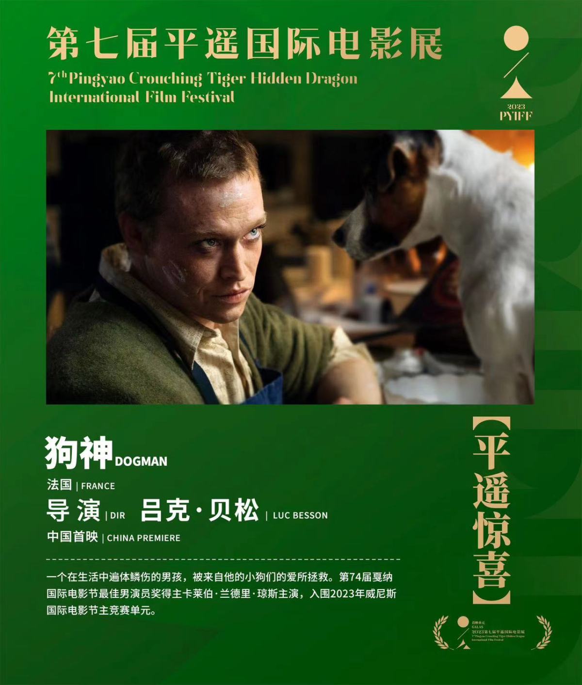 【點新聞報道】由呂克·貝松執導,卡賴伯·蘭德里·瓊斯主演的影片《狗神》(DOGMAN)將作為第七屆平遙國際電影展「平遙驚喜」影片,於10月15日在平遙電影宮「站台·露天劇場」進行中國首映。屆時,呂克·貝松導演本人也將親臨現場,與平遙電影展觀眾進行交流。