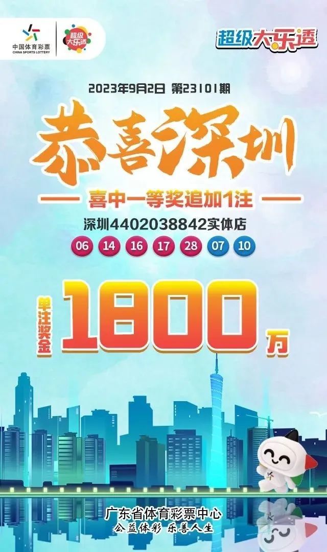 報道指,近日,體彩超級大樂透第23101期全國開出4注一等獎,其中1注1800萬元(含800萬元追加獎金)追加投注一等獎花落深圳。售出這張彩票的是寶安區麻布社區新灣路9號的4402038842實體店,中獎票為一張「9+2」組合複式票。不過自開獎後到現在已經過去一個多月,至今仍然沒有人兌獎。