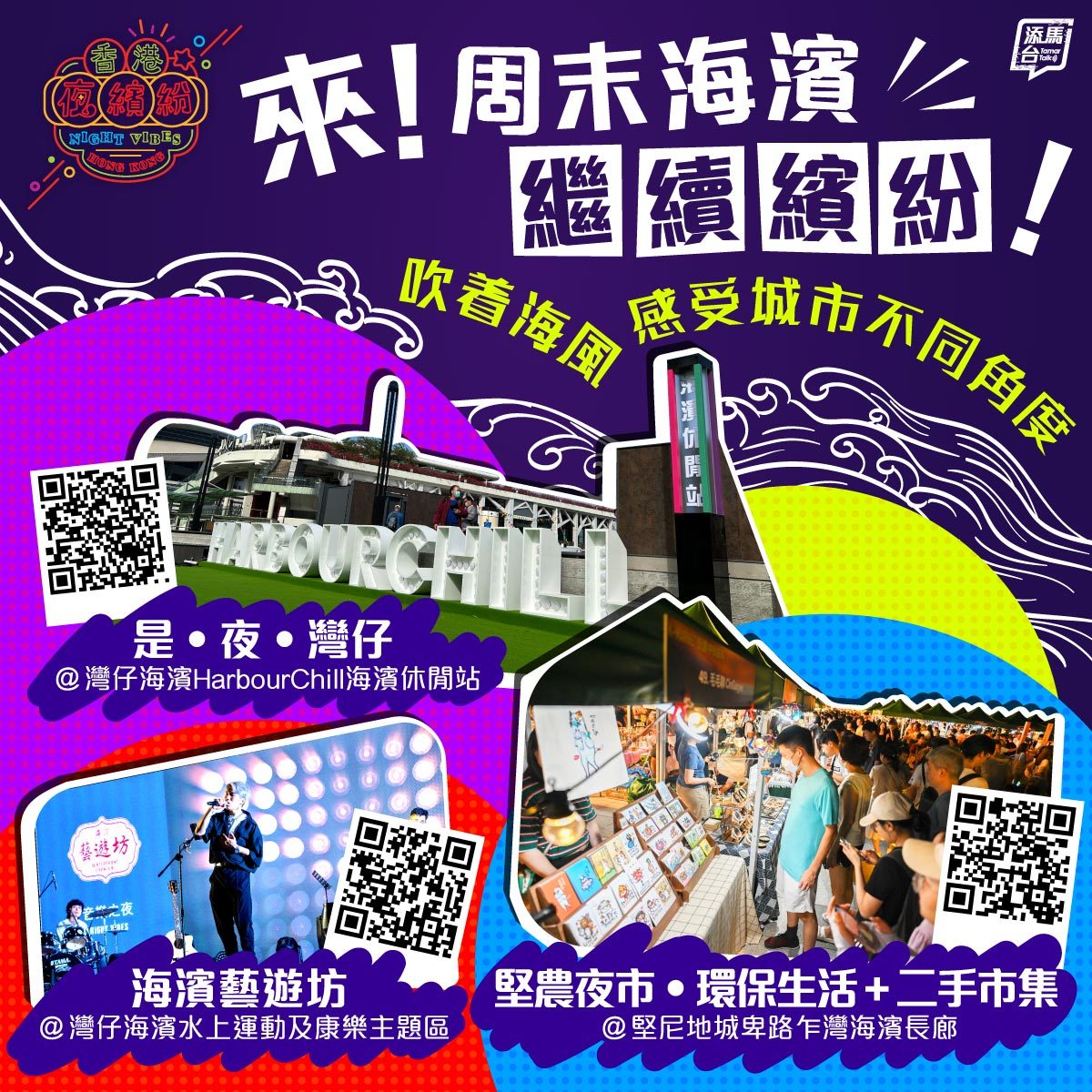 大家一起吹吹海風,感受香港晚間熱鬧氣氛!要注意的是,「是.夜.灣仔」與「海濱藝遊坊」在灣仔海濱兩個不同位置舉行。