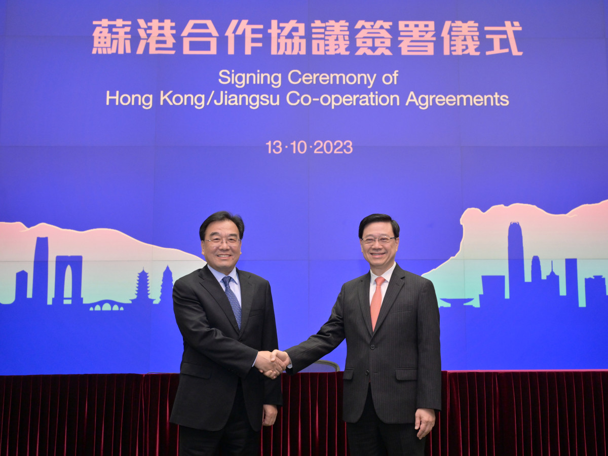 【點新聞報道】行政長官李家超率領香港特別行政區政府代表團與江蘇省委書記信長星率領的江蘇省政府代表團今日(13日)在香港舉行蘇港高層會晤暨蘇港合作協議簽署儀式,共同見證香港和江蘇兩地簽署多項合作協議,推進深化雙方的共同發展,強化優勢互補,實現互利共贏。
