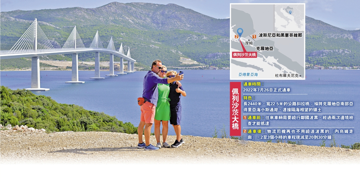 綜合人民日報、新華社報道:沿着克羅地亞狹長的海岸線一路向南行駛到科馬爾納地區,遠眺可見如銀鏈般橫卧在山海之間的佩列沙茨大橋。在橋頭一側的休息區是理想打卡點,來自克羅地亞北部的卡塞爾特地自駕來到這裏,他讚嘆:「這是我們心中最美的大橋!」