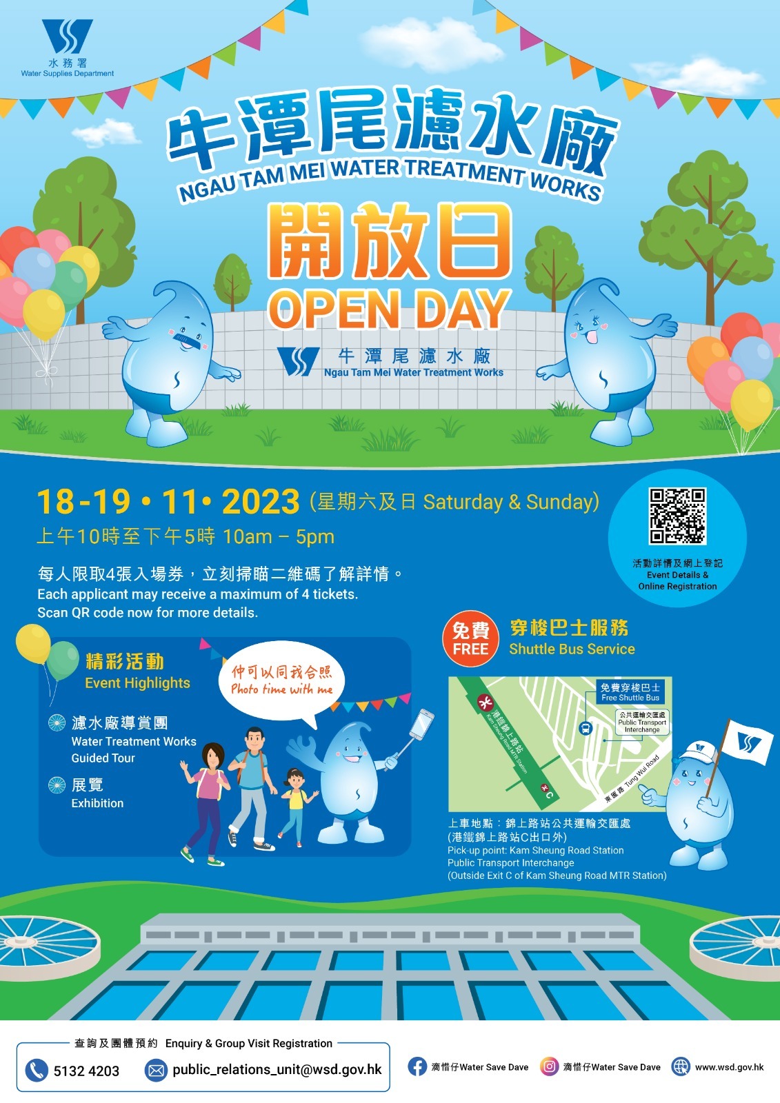 開放日於上述兩日的上午10時至下午5時期間舉行,基於安全理由,年滿8歲或以上小童方可參加導賞團;而12歲以下小童須有成人陪同方可進入濾水廠。參加市民須在10月13日至10月26日下午6時期間,在登記系統預先預約參與活動時段,如報名人數超出限額,將以電腦抽籤形式處理。每人最多可索取4張入場券,費用全免;成功獲取入場券人士會於11月4日或之前經電郵收到電子入場券。
