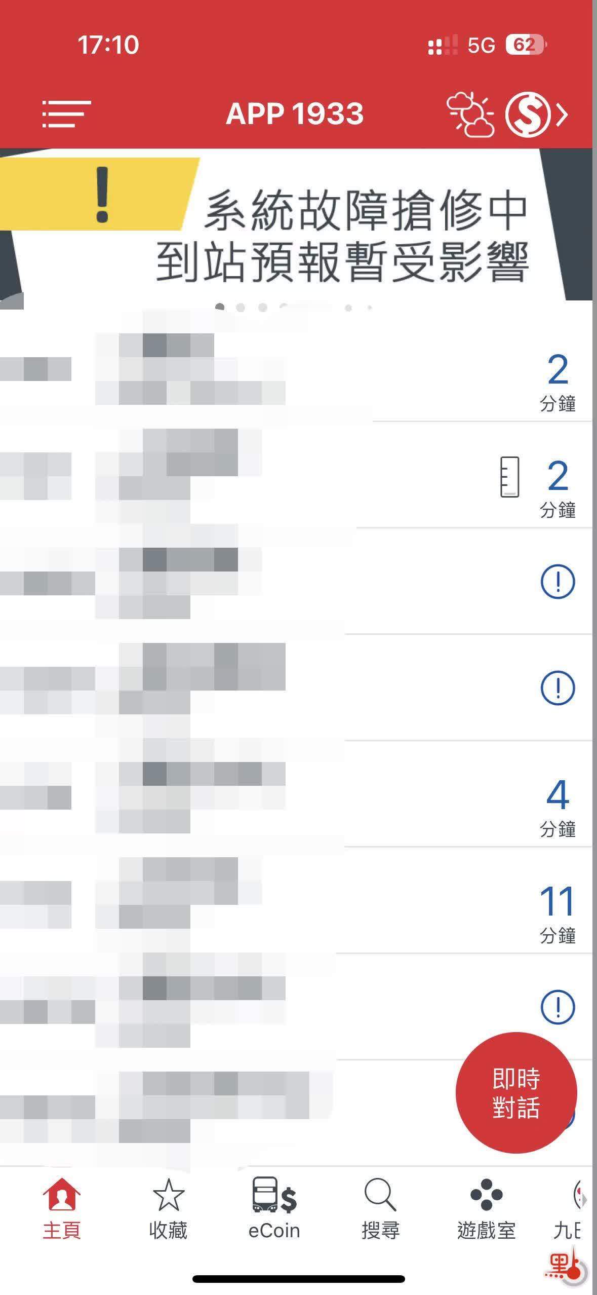 記者於下午5時打開「APP 1933」,發現部分巴士線有顯示到站時間。APP上方有大字警告「系統故障搶修中 到站預報暫受影響」,入內則是通告:「因系統故障,巴士預計到站時間暫停運作,不便之處,敬請原諒。」