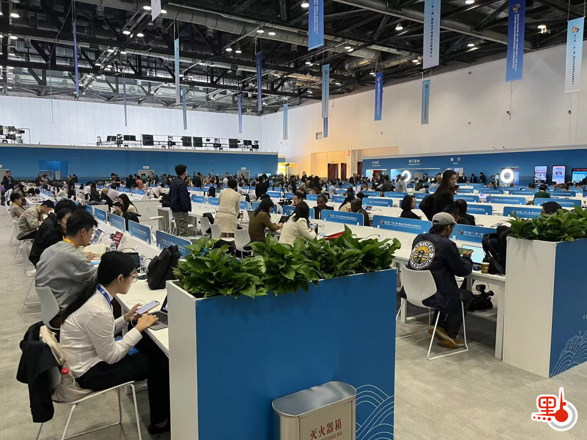除了滿足記者報道需求,新聞中心還設有多項科技文化宣傳項目。在科技文化互動展示區,中外記者們興趣盎然地描臉譜、繪古瓷,深切感受中國的傳統文化技藝。文宣品展台也十分吸睛,免費向媒體提供的書籍、會刊、明信片種類豐富、羅列整齊,中外記者紛紛在此排起長隊等待領取。