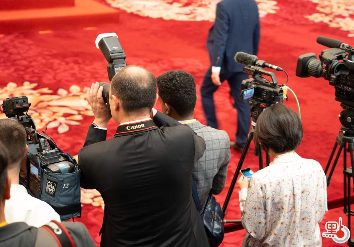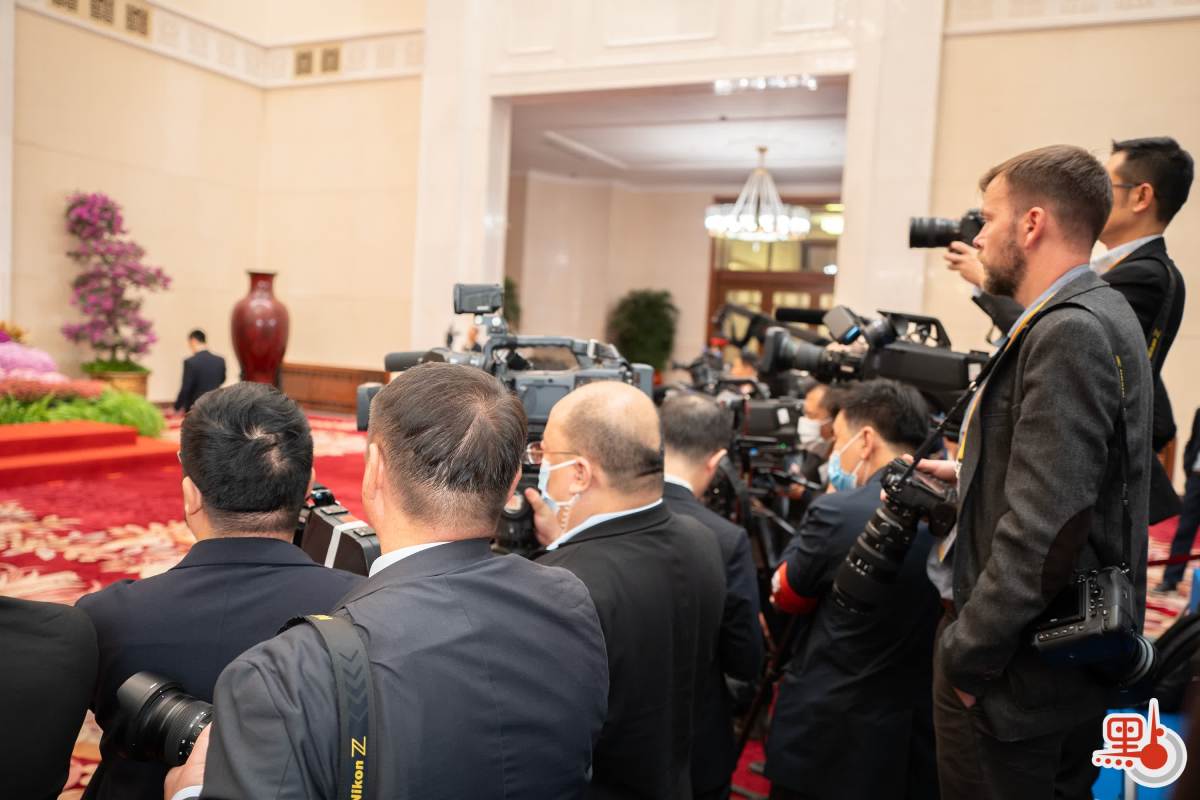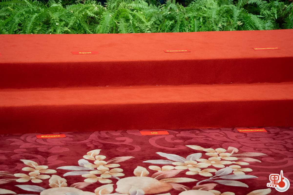 記者看到,領導人合影區的兩層台階上,早已貼好了紅底黃字的國家英文名稱,方便領導人入場後準確找到站位。合影開始前,工作人員貼心地為中外記者高聲朗讀了國家名稱,為在場記者提前了解位置、拍攝照片提供便利。