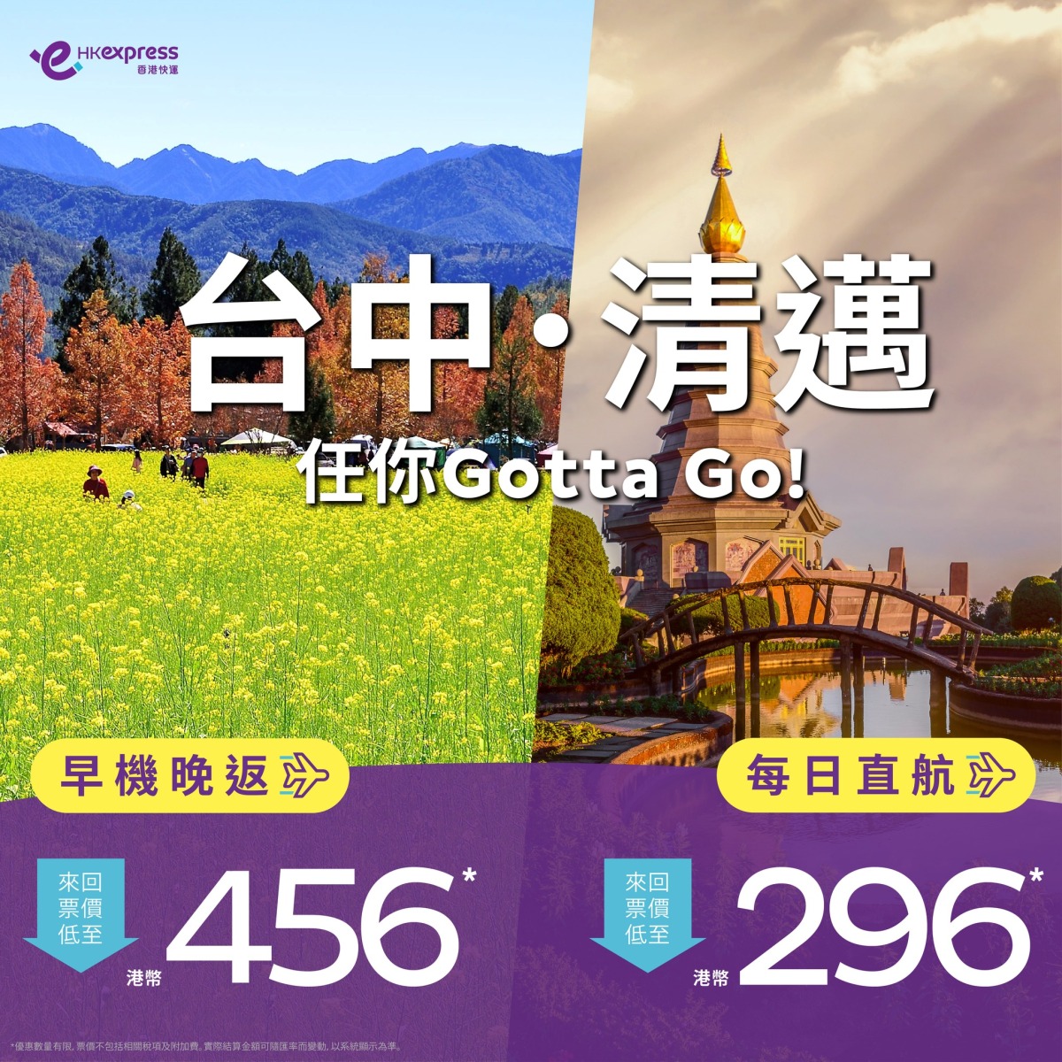 香港飛清邁單程148元起;香港飛台中單程228元起