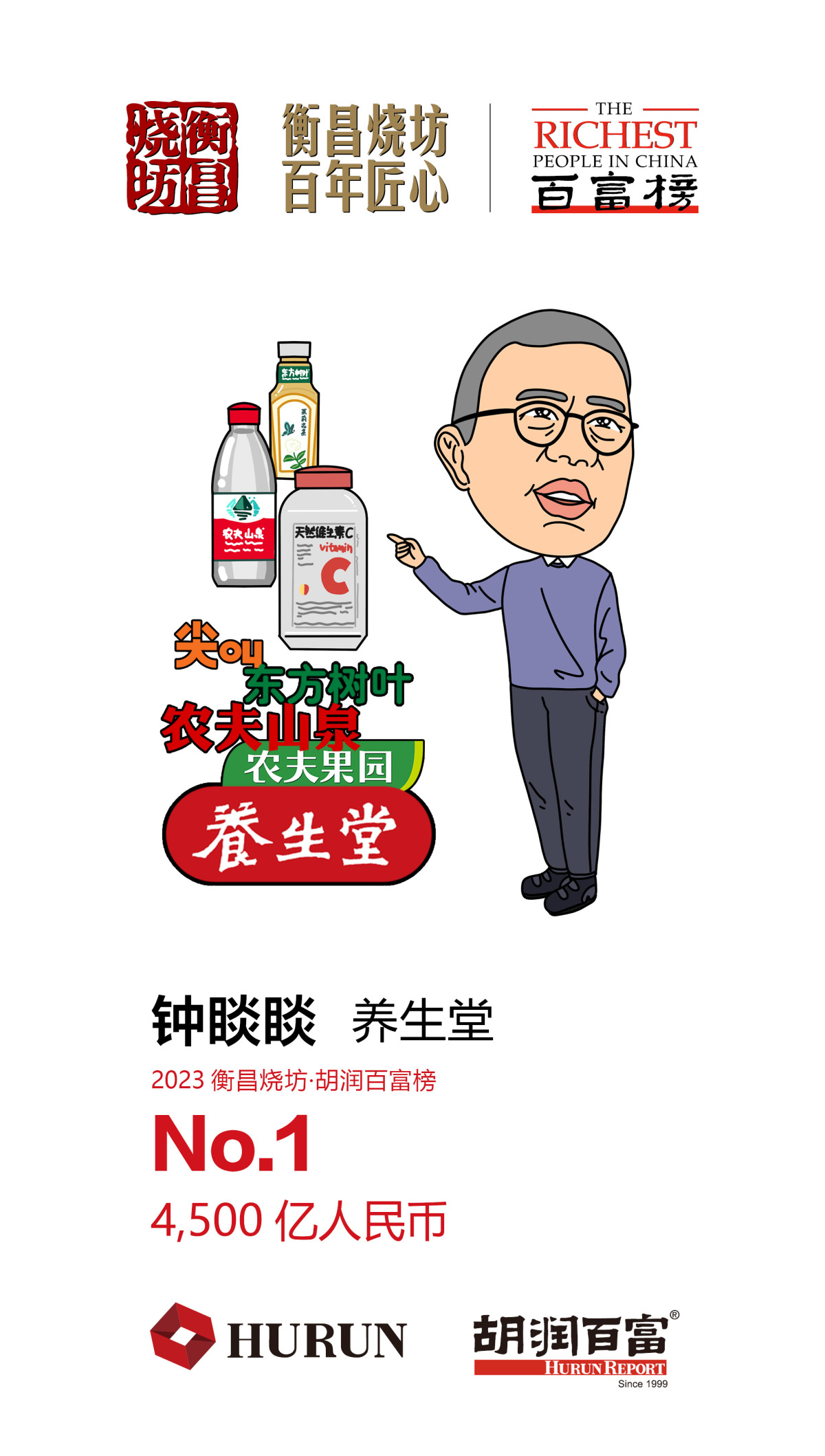 【點新聞報道】今日(24日)下午,《2023衡昌燒坊·胡潤百富榜》在成都發布,共有1241位個人財富50億元(人民幣,下同)以上的企業家上榜,農夫山泉69歲的鍾睒睒財富基本與去年持平,以4500億元第三次成為中國首富。港澳台企業家共142人上榜,比去年多2人,其中台灣82人,比去年多3人;香港60人,比去年少1人,李嘉誠、李澤鉅父子以2100億元位列榜單第七。