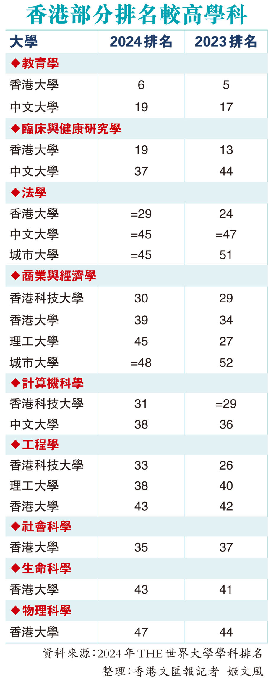國際教育機構泰晤士高等教育(THE)昨日(26日)公布包括社會科學、教育、商業與經濟、法學等合共11個學科的最新全球排名。其中,香港大學的教育學排名全球第六,較2023年排名微跌一位,但仍是今屆11個學科榜單中,唯一打入十大的香港學科。其餘表現較突出的學科包括港大臨床與健康研究以及中大教育學,均在各自的學科排名第十九位。THE指出,今屆排名中,東亞國家或地區的大學在關鍵領域的表現持續增強,包括內地和香港高校均表現出色,尤其清華大學的商業與經濟學及教育學,兩個學科均打入十大。