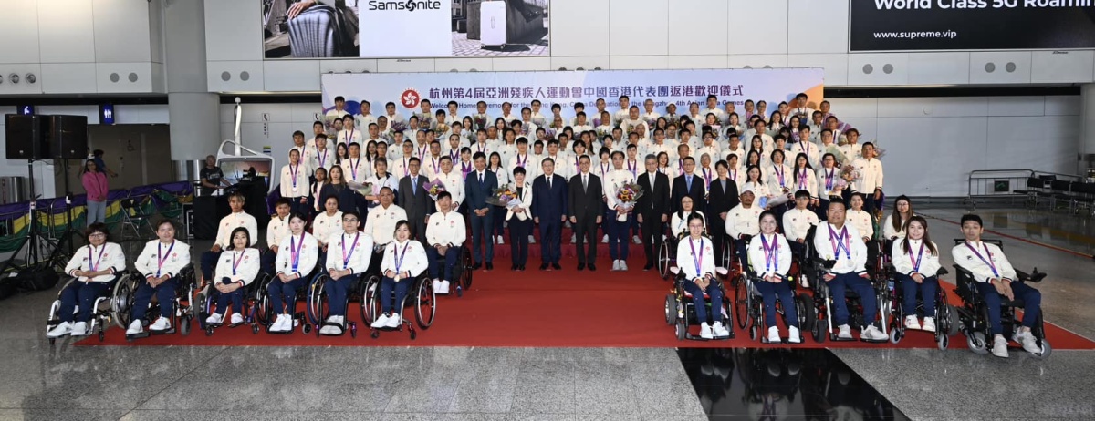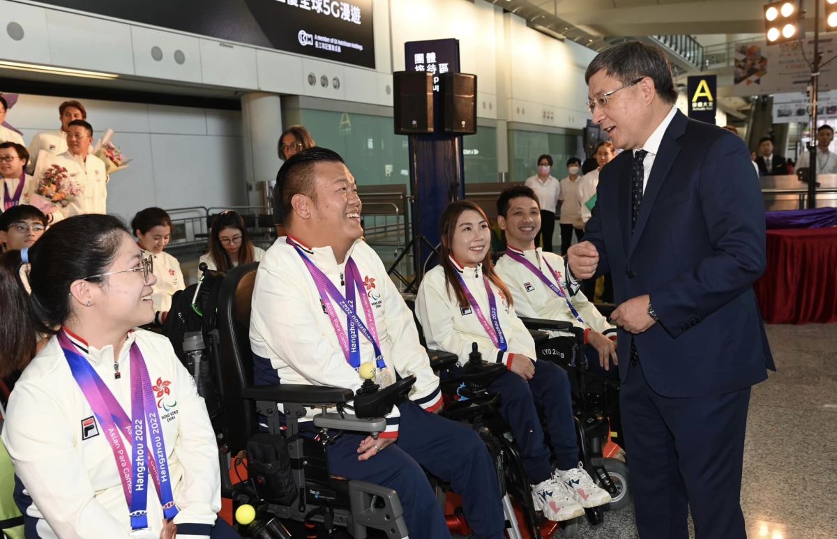 政務司副司長卓永興在社交平台表示,下午到機場迎接返港的香港運動員,感謝他們在亞殘運努力拚搏、取得佳績,令人激賞。他表示,香港運動員在今屆亞殘運奪得8金15銀24銅共47面獎牌,位居獎牌榜第10位,足見代表隊在不同項目都實力非凡。卓永興在迎接儀式上和一些運動員交談,感受到他們的雀躍和為他們感到自豪,並祝願他們再接再厲,在每一次征途超越自我,再創高峰。