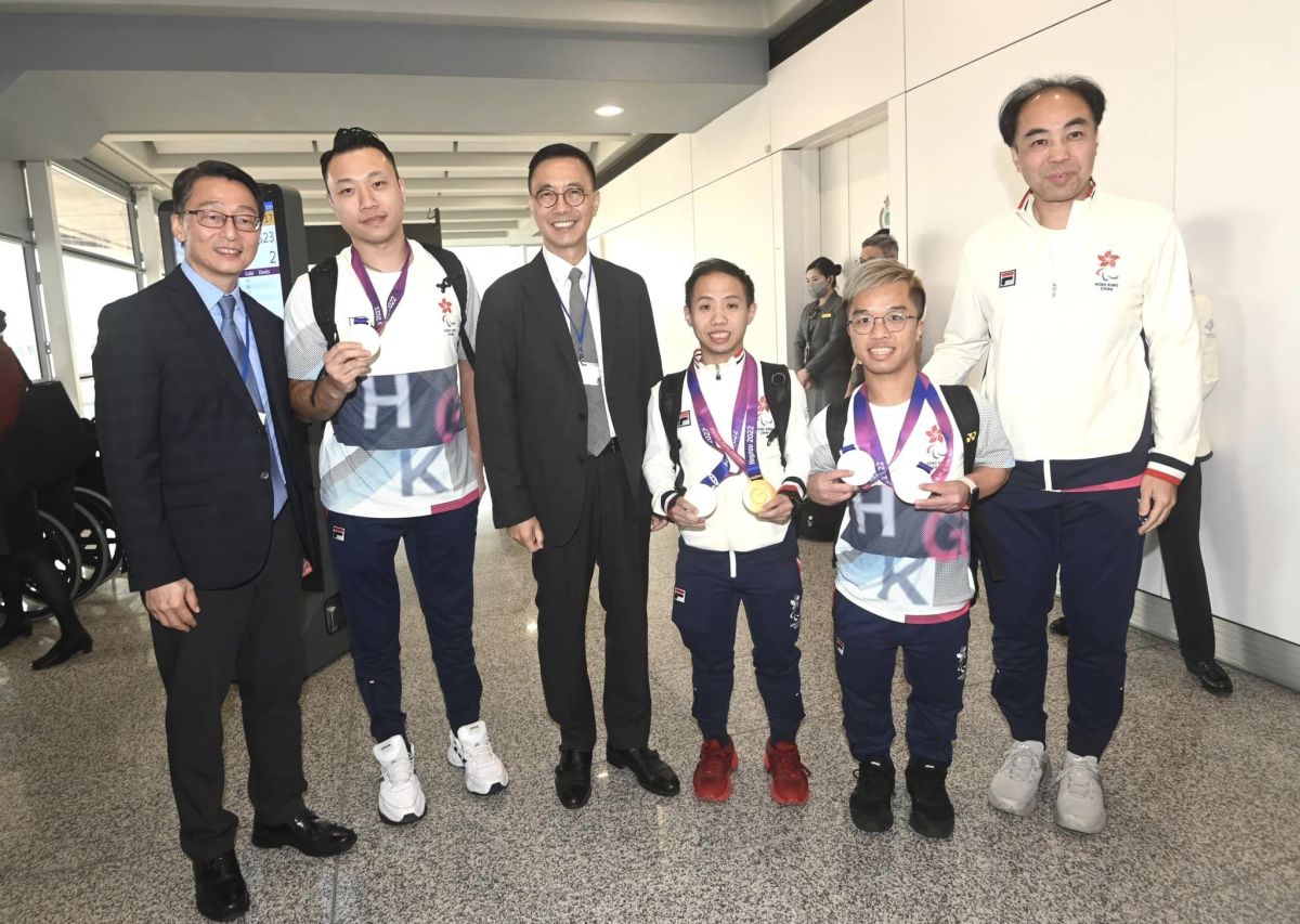 【點新聞報道】杭州第4屆亞洲殘疾人運動會28日圓滿結束,港隊代表團昨、今(29日)兩日分批返港,政府在機場舉行歡迎儀式,政務司副司長卓永興、文化體育及旅遊局局長楊潤雄等官員到機場迎接,向他們送上最衷心的祝賀。