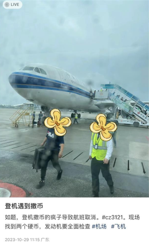 據中國南方航空消息:10月29日9時,南航CZ3121(廣州-北京大興)航班在上客期間,機務人員發現有旅客往飛機投擲硬幣並立即進行安全檢查,在機腹附近區域發現兩枚硬幣。為確保飛行安全,公司決定推遲起飛,對飛機開展全面檢查,在確保未發現其他隱患後,航班於13:29起飛,16:00安全抵達目的地。涉事旅客已被機場公安帶走配合調查。南航提醒廣大旅客朋友,乘坐飛機時務必遵守民航法律法規,禁止做出危害航空安全的行為。
