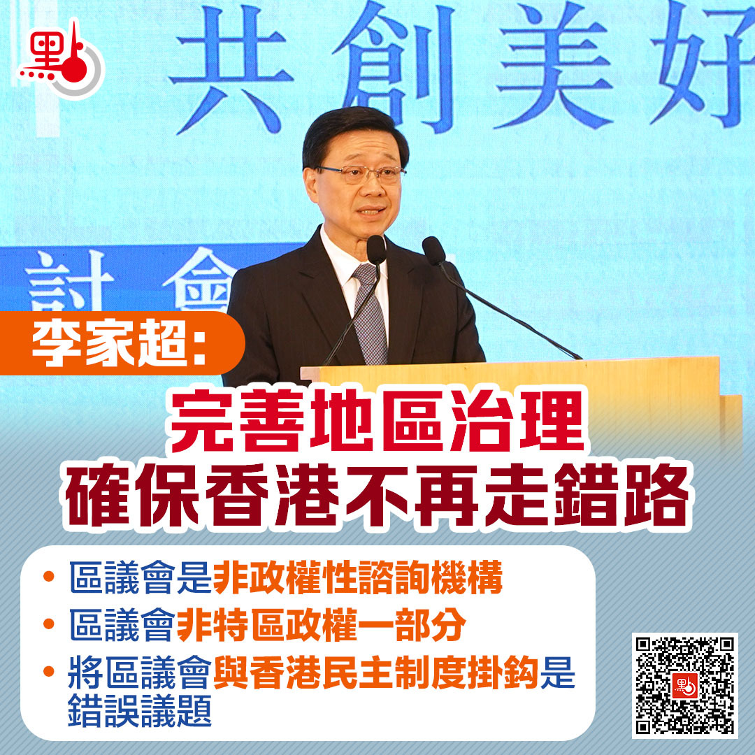 李家超提到,基本法第97條明確規定區議會的本質是「非政權性」的諮詢機構,因此不是代議機構,不是民主制度的一部分,按基本法沒有行政權。因此,討論區議會中的所謂民主成分是錯誤引導,是偽命題。區議會從來都不是特區政權的一部分,因此把它和香港民主制度掛鈎,是錯誤議題,是被錯誤導向。完善地區治理是確保我們不再走錯路,按自身整體利益,推進優質制度發展,優質民主發展。