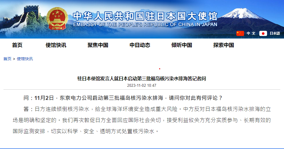 據中國駐日本大使館網站消息,11月2日,日本東京電力公司啟動第三批福島核污染水排海。對此,中國駐日本使館發言人表示,日方連續傾倒核污染水,給全球海洋環境安全造成重大風險。