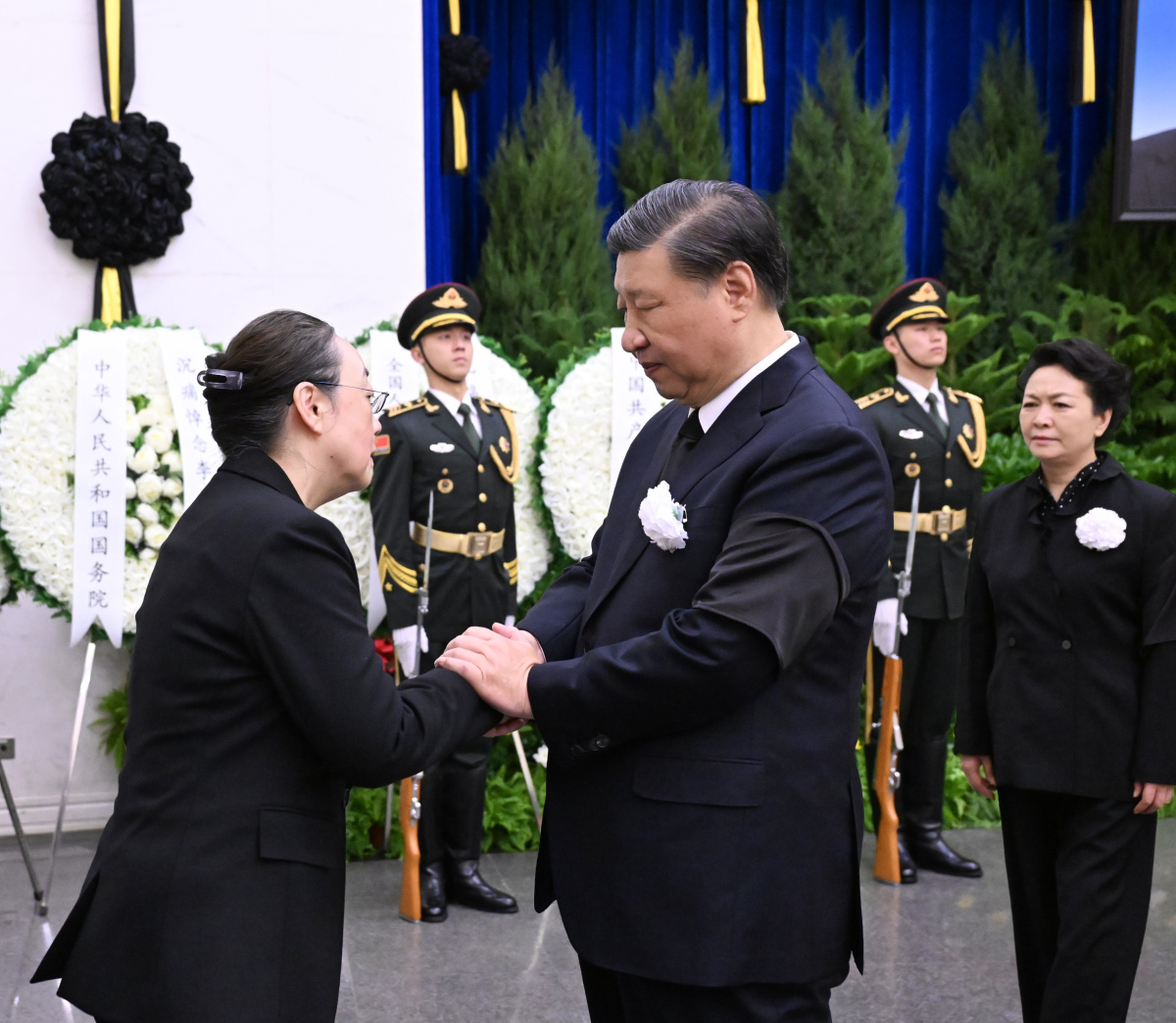 上午9時許,習近平和夫人彭麗媛,李強、趙樂際、王滬寧、蔡奇、丁薛祥、李希、韓正等,在哀樂聲中緩步來到李克強同志的遺體前肅立默哀,向李克強同志的遺體三鞠躬,並與李克強同志親屬一一握手,表示慰問。胡錦濤送花圈,對李克強同志逝世表示哀悼。