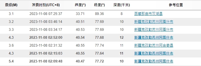 據新華社報道,根據中國地震台網正式測定,11月8日2時9分,在新疆克孜勒蘇州阿圖什市(北緯40.47度,東經77.72度)發生5.4級地震,震源深度10公里。此後,該地區在兩個小時內又發生5次地震,包括4.3級地震兩次,3.2級、3.3級 、3.6級地震各一次。