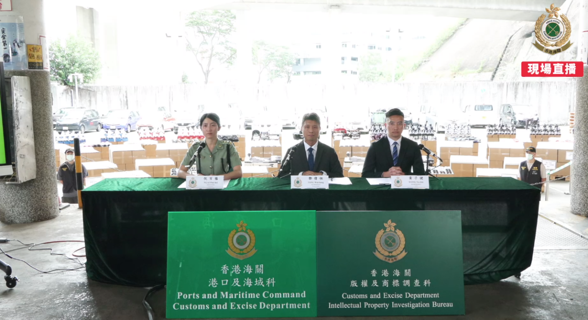 【點新聞報道】海關日前採取打擊跨境轉運及供應本地冒牌及侵權貨品活動「追跡者VI」,共檢獲約7.7萬件懷疑冒牌及侵權波鞋、手提電話、衣服、手錶等,以及約13升懷疑未完稅烈酒,估計市值共超過6700萬元,應課稅值約9萬元,貨值是歷來最高。行動中有3名本地人士(2女1男)被捕。